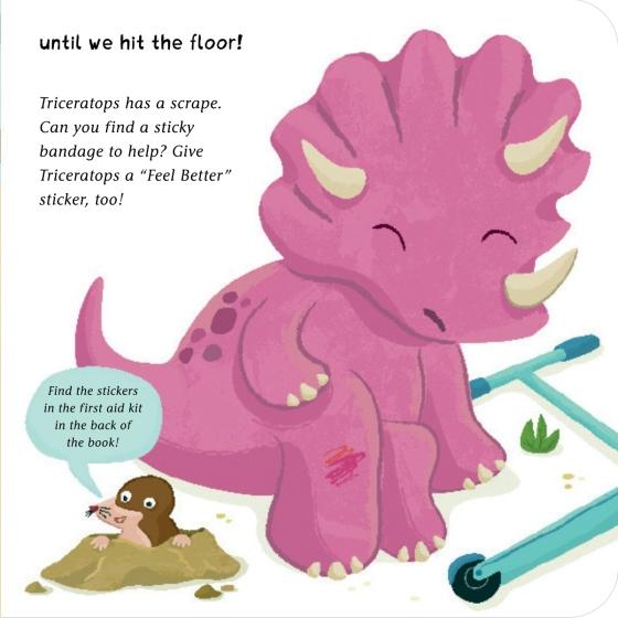 Little Dino Boo-Boos! is about dinosaur friends who have tummy aches, sniffly colds, and bumps and scrapes! Young children will be delighted to finding the right sticker for each familiar childhood illness or injury to help the dinosaurs get better. With a fun rhyming text, dinosaur puns, and a fold-out first aid kit containing reusable remedy stickers,
