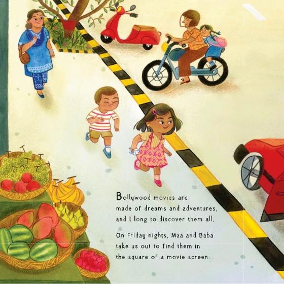 A Bollywood film brings people together—and inspires a little girl’s budding ambition—in a heartfelt and joyful picture book debut from a new talent.It’s Friday night, and on the bustling streets of Mumbai, a girl heads out with her family to the cinema. As she rides through the winding blocks with her maa, baba, and bhai, old melodies fill the car. And as she captures the sights and sounds of the city with her camera, she imagines a movie unfolding before her eyes. A choreographed dance sequence atop a long line of cars! When they arrive at the screening, the room is abuzz with people from all walks of life, waiting to lose themselves in the show. And finally comes the best part: time for everyone to jump up and dance! First-time author-illustrator Avani Dwivedi offers a buoyant, whimsically illustrated love letter to Mumbai and Bollywood—and to children everywhere eager to take mastery of their dreams.