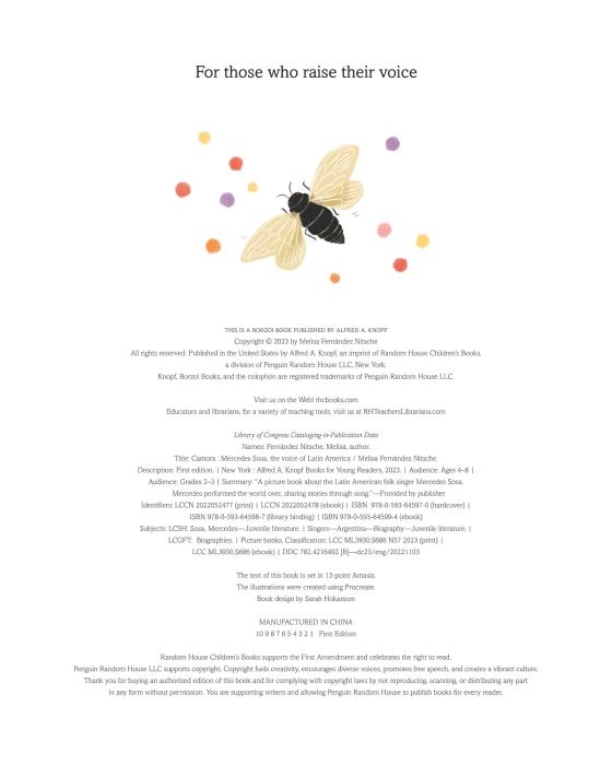 beautiful job of introducing Argentinian folk singer Mercedes Sosa to a young audience in this picture-book biography"
