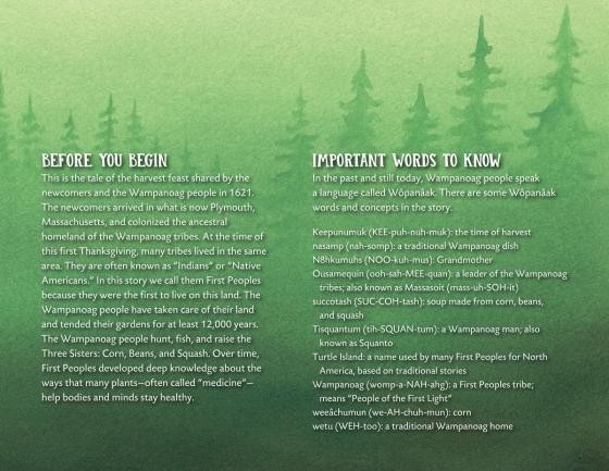 A much-needed Thanksgiving retelling that centers the Wamponoag people. (glossary, information on the Wampanoag map, recipes)