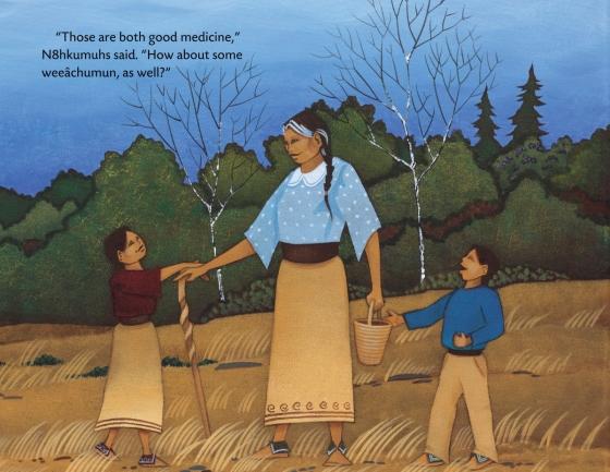 starred reviewThis picture book features a contemporary Wampanoag grandmother and her grandchildren. N8hkumuhs shares the story of the Three Sisters—Corn, Beans, and Squash—and the first Thanksgiving, known as “Keepunumuk” by the Wampanoag people. The book transitions into a combination of history and storytelling about contact between the “First Peoples” and the newcomers. This format will be novel to some young children given the setting and timeframe of the story, though the book attempts to differentiate the parts that are the story by changing the typeface and including ethereal-like images of the Three Sisters. “Before You Begin” and “Important Words to Know” sections also provide context. Rich back matter includes more information about the Wampanoag tribes, a traditional recipe, and a photo and information about the real Maple and Quill, the grandchildren in the story. Overall, this story is a good addition for the historical knowledge of the first Thanksgiving from the Wampanoag viewpoint.