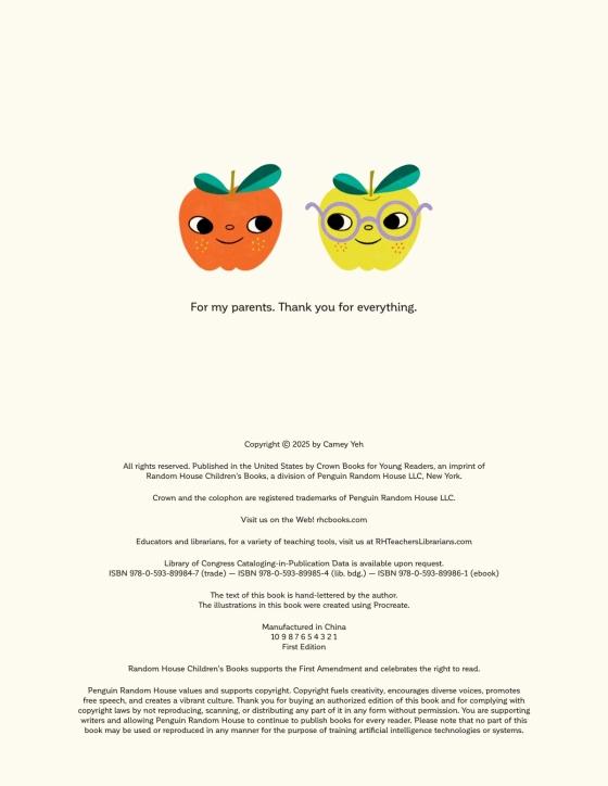 Camey Yeh grew up as a Taiwanese American kid feeling a little different from other kids around her. She is now grateful for the way those experiences shaped her into who she is. Today, Camey is an illustrator and writer living in San Francisco with her big fluffy cat, Otis. She draws totally cool stuff inspired by everyday life, big feelings, and little treats.