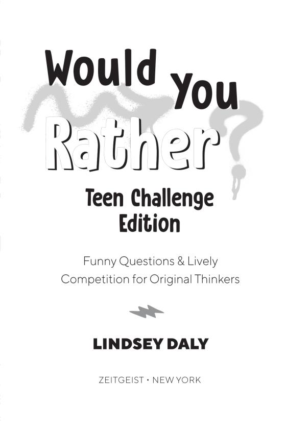 From the best-selling author of Would You Rather? Made You Think! Edition, a laugh-out-loud game of challenging “Would You Rather?” questions for teens.Help your teen take a break from social media, school, and everyday teen stress with this super fun game of 160+ hilarious “Would You Rather?” questions designed specifically for them. Covering topics teens care about and contemplate—from technology to entertainment to adventure—this age-appropriate book gives teens space to laugh, think, and hang out as they try to win the Would You Rather? trophy.