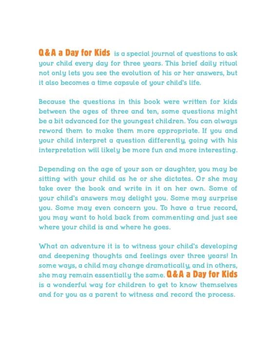 This journal is the perfect family keepsake: A place for parents and children to share the evolution of thoughts, feelings, and dreams over the years, or a journal for kids who want to keep a time capsule of their own ideas about the world—whimsical or serious.Children's author Betsy Franco poses a question each day with only a few lines provided for a response, making this journal the ultimate no-fuss record keeper. Simply turn to today's date and record your child's answer. When you finish the year, move on to the next section. The diary can be started on any day of the year and makes a terrific keepsake or gift for parents.