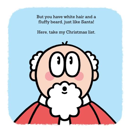 He says he’s just a regular old man, but he has a fluffy white beard and a red coat and hat, and even says "Ho ho ho"! He