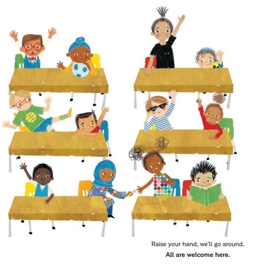 Readers will follow a group of children through a day in their school, where everyone is welcomed with open arms. A school where students from all backgrounds learn from and celebrate each other's traditions. A school that shows the world as we will make it to be.