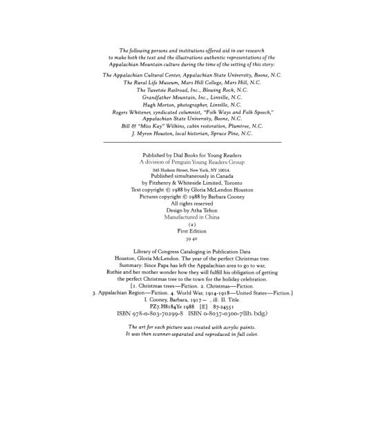 A touching and joyful Christmas classic about courage and family, illustrated by Caldecott Medalist Barbara Cooney.In the mountains of Appalachia during World War I, Ruthie and her mother prepare to bring the town’s Christmas tree to life, while Ruthie’s father is away at war. Together the two celebrate the strength of family, the warmth of community, and the deeper meaning of Christmas.