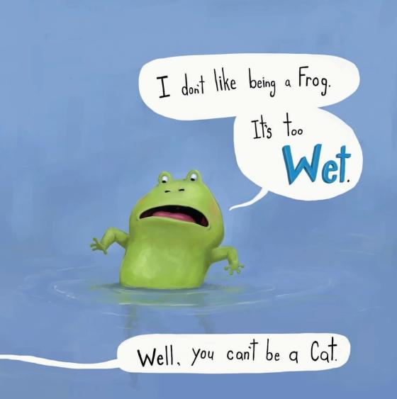 Frog wants to be anything but a slimy, wet frog. A cat, perhaps. Or a rabbit. An owl? But when a hungry wolf arrives—a wolf who HATES eating frogs—our hero decides that being himself isn’t so bad after all. In this very silly story with a sly message, told in hilarious dialogue between a feisty young frog and his heard-it-all-before father, young readers will identify with little Frog’s desire to be something different, while laughing along at his stubborn yet endearing schemes to prove himself right.