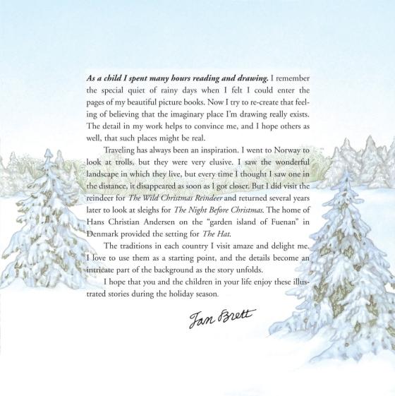 Jan Brett is one of the nation's foremost illustrators of children's books. As a child, she decided to be an illustrator and spent much of her time reading and drawing. As a student at the Boston Museum School, Jan spent many hours in the Museum of Fine Arts. Travel is also a constant inspiration, so with her husband, Joe Hearne, who is a member of the Boston Symphony Orchestra, she visits many different countries where she researches the architecture and costumes that appear in her work. Jan lives in a seacoast town in Massachusetts.