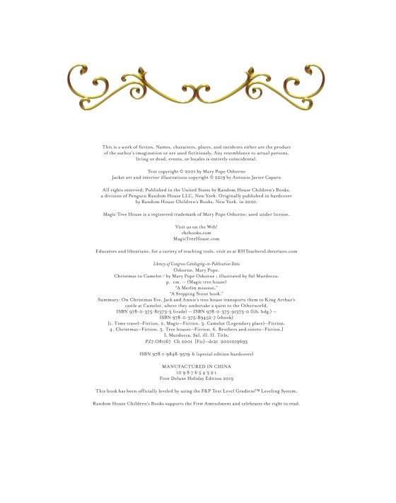 Christmas has never been more magical! Travel to Camelot with Jack, Annie and The Magic Tree House in this holiday fantasy adventure! Now in a super-giftable deluxe edition with color illustrations!When Jack and Annie receive an invitation to spend Christmas Eve in Camelot--a magical place that exists only in myth and fantasy--they know they are in for their biggest adventure yet. What they don't know is that the invitation will send them on a quest to save Camelot. Can they succeed even though Camelot's greatest knights have failed?