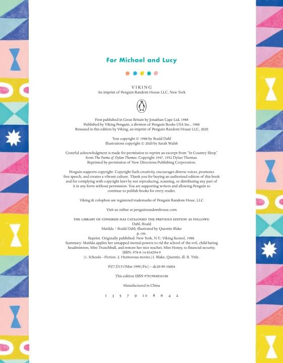 A brand-new, completely illustrated, full-color edition of Roald Dahl's beloved classic Matilda with all-new artwork by illustrator Sarah Walsh.