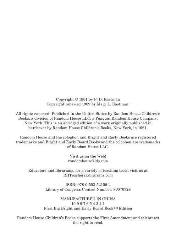 NATIONAL BESTSELLER • A beloved Bright and Early Board Book by P. D. Eastman—now in a larger trim size, perfect for babies and toddlers!This abridged version of the classic Beginner Book features red dogs, blue dogs, big dogs, little dogs—all kinds of wonderful dogs—riding bicycles, scooters, skis, and roller skates and driving all sorts of vehicles on their way to a big dog party held on top of a tree. A perfect gift for baby showers, birthdays, and happy occasions of all kinds, it will leave dog lovers howling with delight!