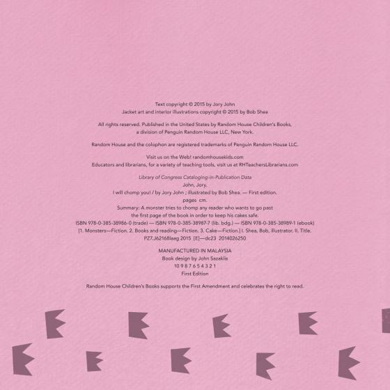 Starting on Page 1, the protagonist monster uses direct address to warn readers not to turn any pages. The book’s very title reveals the threat behind this warning, and Shea’s toothy monster—all mouth and head and bluster—seems ready to follow through with it. Disobeying the command provokes metafictive peril as warnings to readers persist, and various small creatures depicted on the page (a bird, a frog, and a wee bunny) flee its chomping jaws. The monster misses both them and disobedient readers, growing increasingly angry. Clever illustration choices make it seem as though the monster has chomped through the pages of the book, and soon its commands devolve into pleading. Why? “It’s because I have all my cakes back here, at the end of the book,” the greedy monster explains. In a fiendish ploy to trick readers, the monster offers to share, saying, “just come a little closer…” and a page turn reveals (yet another) “CHOMP!” Defeated, the monster resigns itself to readers’ progress toward the end of the book, and it chomps up all the cakes, leaving it with the just deserts of a bellyache. Throughout, Shea’s vibrant, silly pictures diminish the scariness of the story’s premise and deliver humorous characterization.