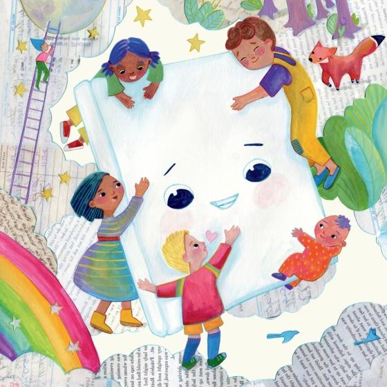 "Bright illustrations make use of collage, incorporating the pages of a book into trees, children’s clothing, and wallpaper.