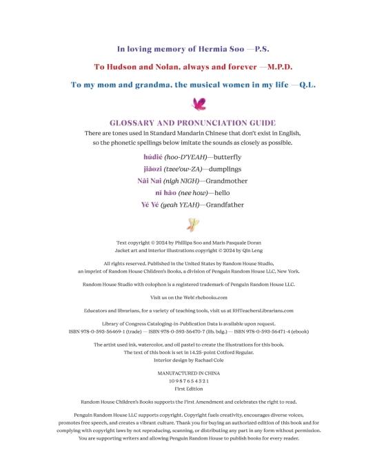 Piper Chen loves nothing more than to sing. She sings to the sun, and she sings to the moon. She sings to her stuffed animals and with the birds outside her window. So, when her music teacher asks if Piper would like to sing a solo in her school’s Spring Sing, all she can say is “yes!” But as practice continues, doubt and worry creep in and Piper’s confidence wavers. She feels like butterflies are having a dance party in her belly. At home, Piper finds Nai Nai, her grandmother, at the piano. They’ve always shared a love of music, and Piper knows if anyone can help her through the unsettling feeling in her stomach and to shine her brightest at the Spring Concert, it’s Nai Nai.