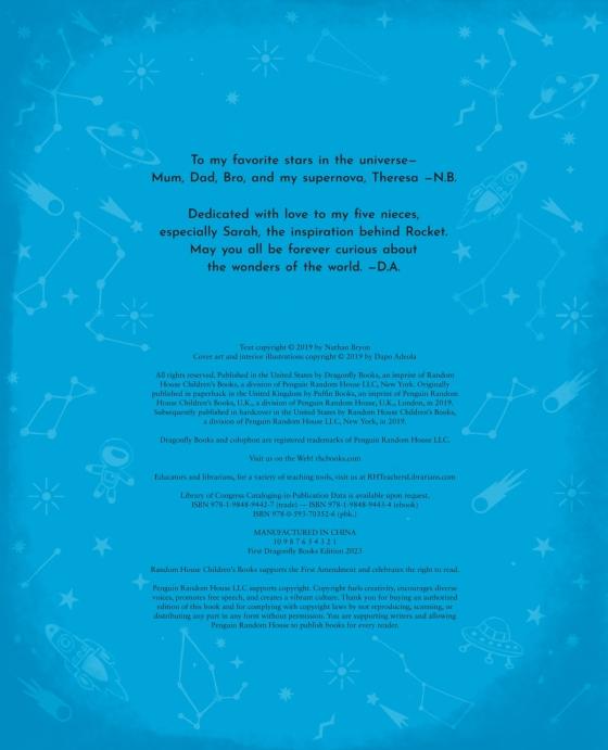 Rocket Says Look Up! will inspire readers of all ages to dream BIG. Award-winning author and illustrator Nathan Bryon and Dapo Adeola have created an irresistible main character with a passion for science and infectious curiosity.