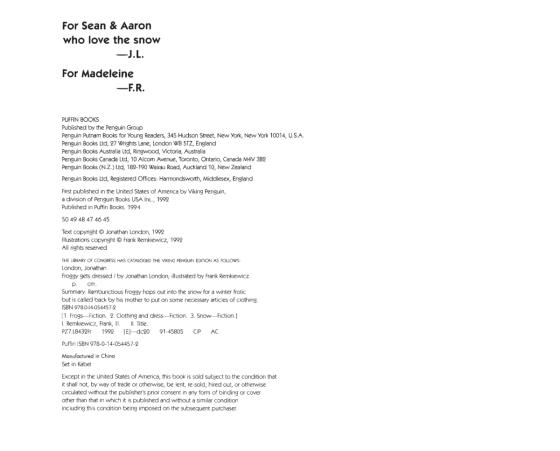 Froggy wants to play outside—but isn’t he forgetting something?When Froggy wakes up to see snow outside his window, he can’t wait to hop and frolic. But going out means putting on a scarf, a hat, a coat . . . so many things to remember! Luckily, his mother is there to call him back and remind him of everything he needs to get dressed.