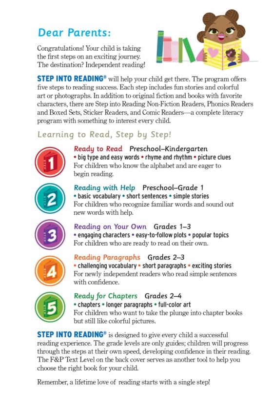 Step 1 Readers feature big type and easy words for children who know the alphabet and are eager to begin reading. Rhyme and rhythmic text paired with picture clues help children decode the story.
