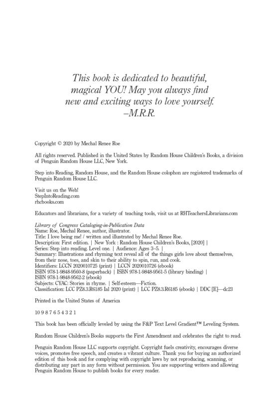 Celebrate diversity and natural Black hair with this bright, joyful level 1 Step Into Reading book that will have girls everywhere repeating the book's chorus: "I love being me!"Girls will love seeing strong, happy reflections of themselves in this vibrant, rhyming, Step 1 reader about the joy of being a girl. Full of positive affirmations and bright scenes of girls enjoying their favorite activities, such as