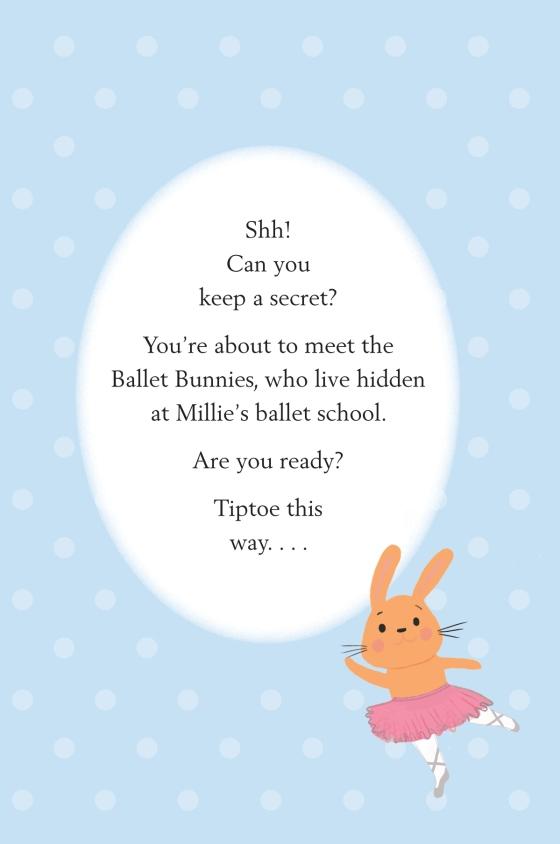 Peek behind the curtain and find the Ballet Bunnies in this new full-color chapter book series featuring the most darling dancers you will ever meet!Miss Luisa's School of Dance is a magical place. There are dancers and music. . . and bunnies that talk and do ballet! No one knows the bunnies are there. Then, Millie arrives. She's new to ballet class and doesn't know all the moves. But when all the other dancers are gone, she discovers the Ballet Bunnies! They can help Millie find her dancing feet--so long as she can keep the Ballet Bunnies a secret!