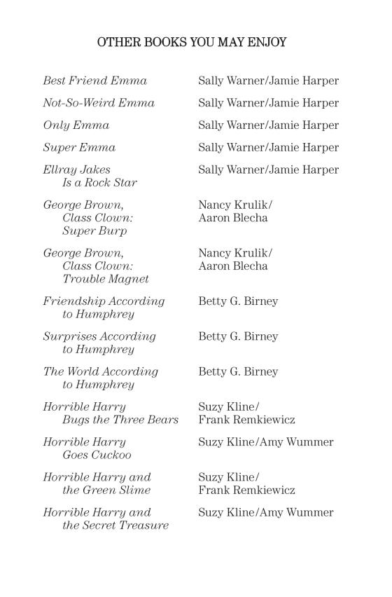 Sally Warner (www.sallywarner.com) has published more than twenty novels for young readers, including the Emma and EllRay Jakes series. She lives in Altadena, California with her husband and their not-so-miniature dachshund, Rocky.