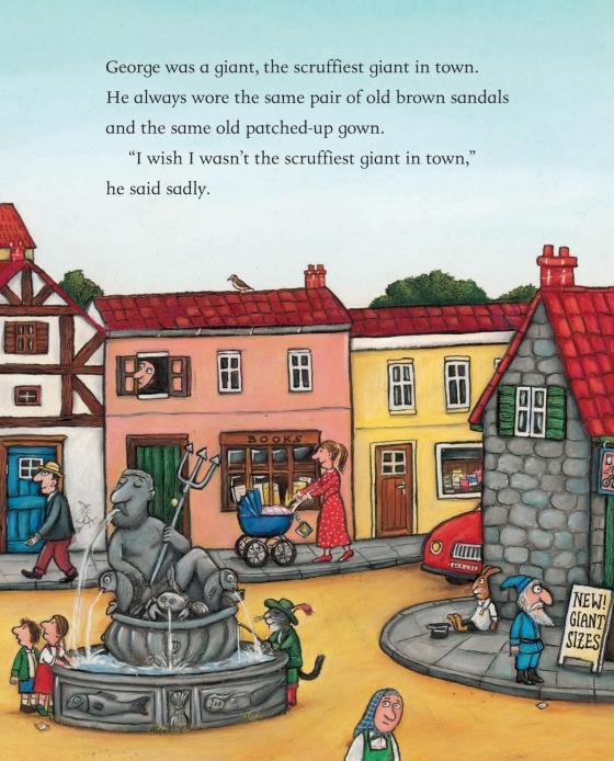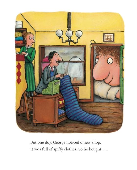 When George the giant spies a shop full of wonderful clothes, he decides to treat himself to a new outfit. He puts on his new shirt, pants, shoes, and tie, and is immediately transformed from the