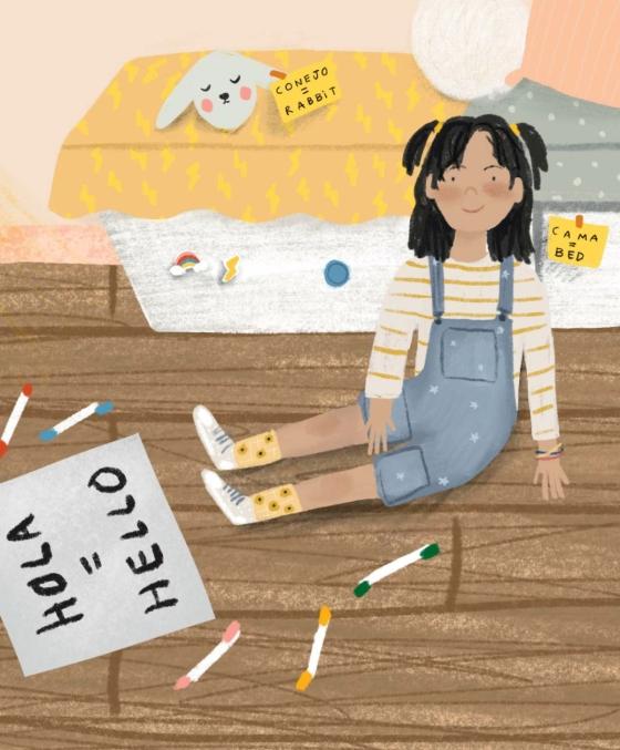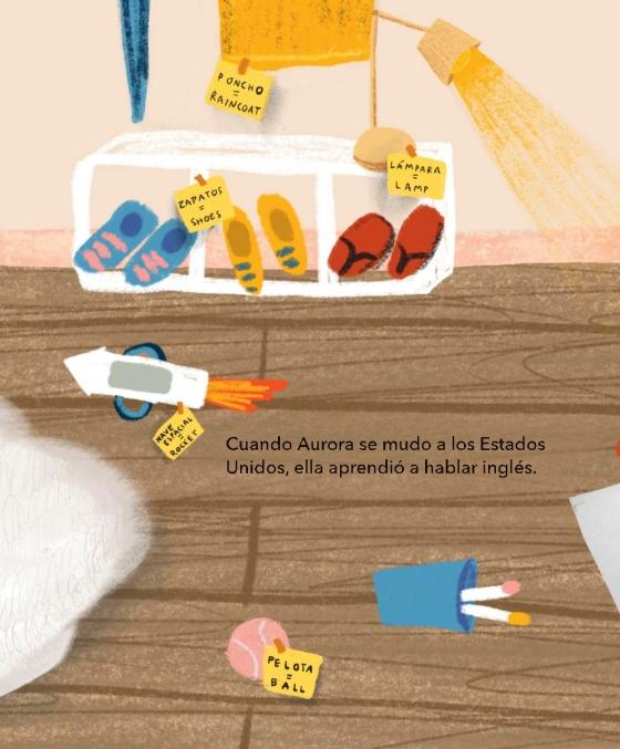 The book employs a visual representation of a common language-learning technique, depicting little labels on everything around Aurora's house that translate the names of objects. The somewhat scribbly, stylized drawings are reminiscent of soft color pastels and have a charming, childlike look. . . a great depiction of what diversity and multiculturalism look like.