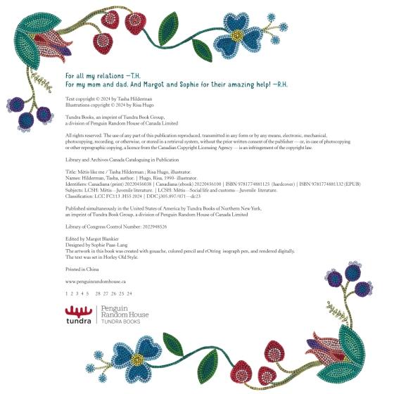 "Colourful illustrations by Vancouver-based Risa Hugo depict a welcoming community, and the embossed beadwork on the cover is a tactile invitation to explore Hilderman’s text, complete with her recipe for bannock and a glossary of Michif words that combine Cree and Métis French."