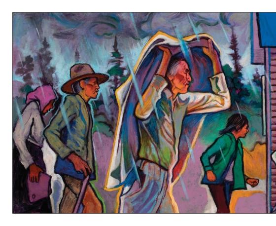 A citizen of the Choctaw Nation herself, Widener relates this inspiring saga with reverence and beauty, constructing an accessible history for young readers that highlights the spectacular results of empathy and compassion. Yazzie's art features striking, sometimes near-fluorescent colors and a multitude of textures. His figures are contained within a thick, black line often outlined by another, lighter color--white, orange, yellow--this acts to bring people forward in each illustration, focusing the eye on the humans.