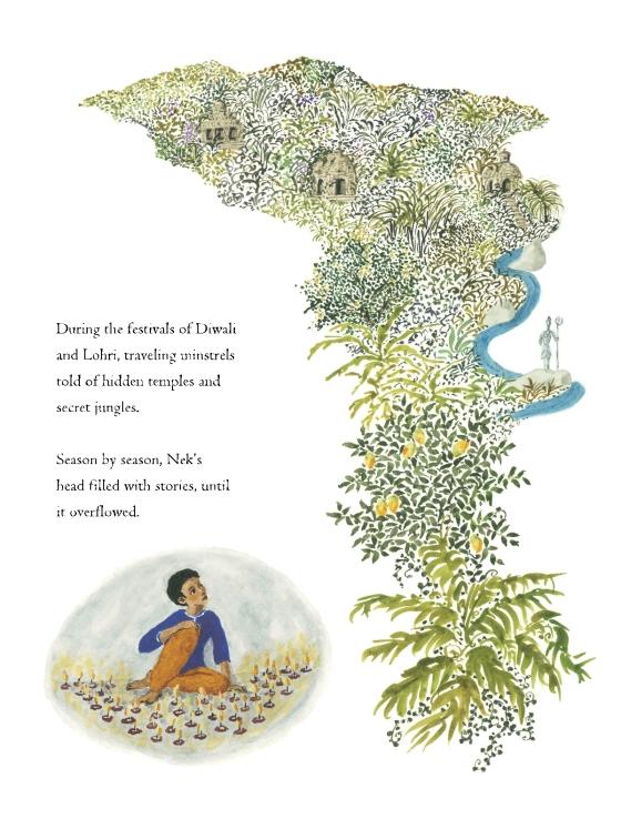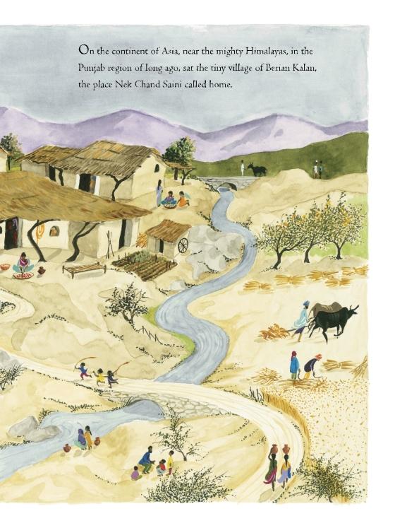 The incredible story of the world’s largest visionary environment: the Rock Garden of Chandigarh, kept secret by outsider artist Nek Chand for fifteen years.After the partition of India in 1947, Nek Chand Saini settled in the city of Chandigarh, with nothing but stories brought from his homeland. Dismayed at his stark new surroundings, Nek began collecting river rocks, broken glass, and cracked water pots found on the roadside. He cleared a section of jungle and for seven years he stockpiled odds and ends. They were castoffs and rubbish to everyone else, but to Nek, they were treasures. He began to build a labyrinth of curving paths, mosaics, and repeating patterns: his very own tribute to the winding village of his youth, a hidden land of stories. Nek kept his kingdom secret for fifteen years, until a government crew stumbled upon it and sought to destroy it. But local fans agreed in awe: the Rock Garden had to be protected. Author Barb Rosenstock introduces readers to the outsider artist’s stunning creation, while Claire A. Nivola’s illustrations bring to life the land’s natural beauty and the surreal world Nek coaxed from his wild landscape.
