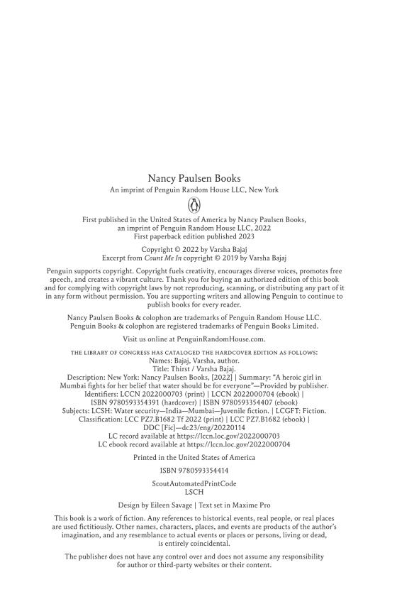 Thirst, a moving, hopeful story. . . . Bajaj thoughtfully examines class and privilege, making topics like water access and income inequality accessible to middle-grade readers. Bajaj shows how a lack of clean water, decent health care and education can affect people's lives. Minni can't focus on schoolwork because she's hungry and exhausted; anger, fear and frustration frequently play out in the water line; and people adapt just to survive their environment (e.g., boiling water to fend off diseases). Water may not flow freely like it does in the high-rise Minni works in, but community and hope do. A sense of togetherness—whether it's Minni's aunties bringing her food or the school guard allowing her to enter school late—pulses through this meaningful narrative.” —