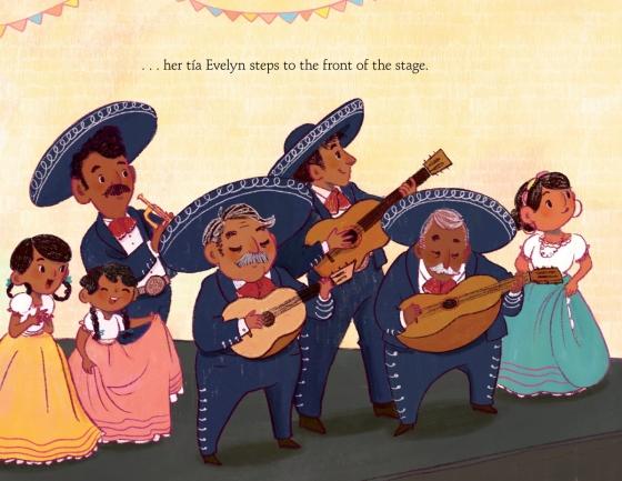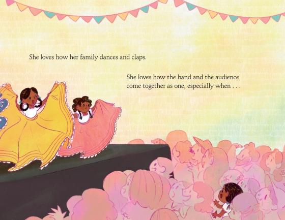 Adela, a broad-faced girl with winsome dark eyes, brown skin, and a middle-parted ponytail, "loves everything about her family's mariachi band--except the fact that she isn't in it." Papá's trompeta only makes a "small, fizzly" sound when Adela plays it. Her tío's vihuela only squeaks for her. Her graceful mamá and sisters can make their folklórico skirts "flow like rainbows," but Adela's dance ends in a face-plant: "SPLAT!" Each failure is announced by Adela with a tiny, plaintive "oy," "iiieee," or "ahh," copies of her tía Evelyn's massive, soulful gritos ("shouts"). Adela realizes as she sits mournfully amid crayon-scribble recollections of her attempts that every skill in the band will take a long time to perfect. Her exclusion seems certain until Adela realizes she can do one thing, after all. At the end of the next show, Evelyn stands back, Papá places his hat on Adela's head, and she joyously shouts los gritos.