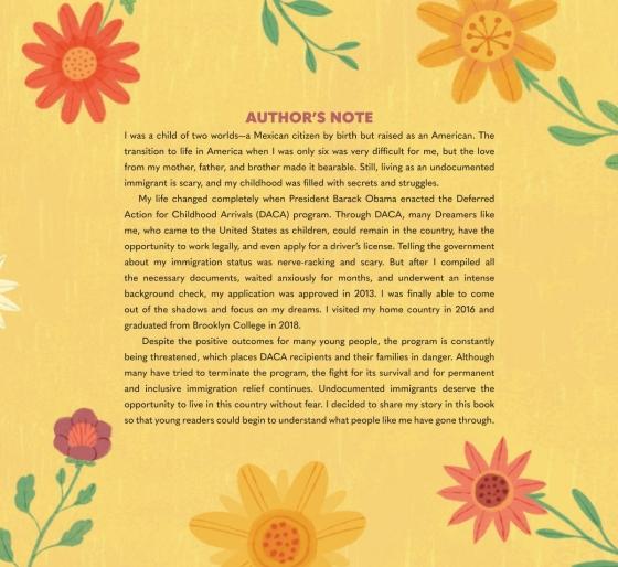 “This book could be used in a social science class highlighting Areli’s capacity to adapt and thrive as she navigates her new environment. It contains an author’s note addressing the fragility of the DACA program and back matter with a glossary defining the Spanish language terms in the story…