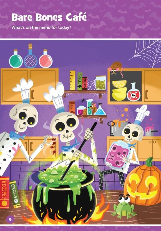 The Halloween sticker activity book includes: