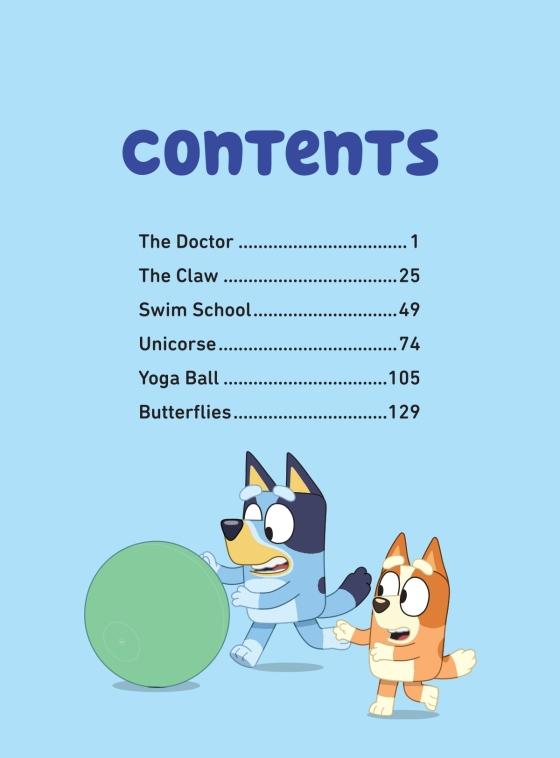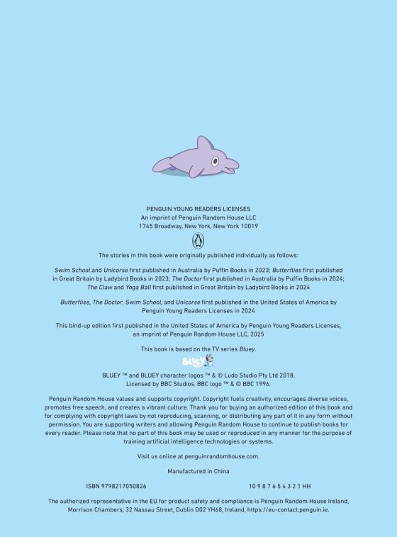A collection of stories crafted for reading in five minutes or less, perfect for fans of the wildly successful animated series Bluey, as seen on Disney+.More Bluey 5-Minute Stories? Hooray! This treasury includes 6 stories about Bluey, Bingo, and their friends and family. Play Butterflies, go to Swim School, and visit the Doctor! This storybook collection is the perfect read for bedtime, when you're on the go, and any time in between.