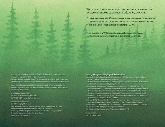 ♦ U.S. Thanksgiving is a day of mourning for North American First Peoples, given that European settlers brought disease and warfare to their land. Greendeer (Mashpee Wampanoag) and her Indigenous cocreators here recount a story of the first harvest feast in 1621 from an Indigenous perspective. When her grandchildren request a story, N8hkumuhs tells of Keepunumuk, the time of harvest. When new people arrive, Weeâchumun wonders if they can be trusted. They build houses on top of an empty village, steal corn seeds for planting, and misunderstand the ways of nature. In the spring, the People (particularly Tisquantum) help the newcomers to grow corn, bean, and squash, and in the fall, both groups celebrate together. Simply told, the story includes many Wôpanâak words and concepts. Three different typefaces distinguish the front and back matter from the modern framework and the older story-within-a story, an aid to younger readers. Meeches’ (Anishinaabe) acrylic illustrations are rendered in an Eastern Woodlands style. Greens and blues complement the earth-toned palette employed on most spreads; particularly effective is the depiction of the Three Sisters, spirits representing corn, beans, and squash. This is a perfect choice for anyone looking for an alternative perspective to the traditional Thanksgiving story or an Indigenous Peoples’ Day read.