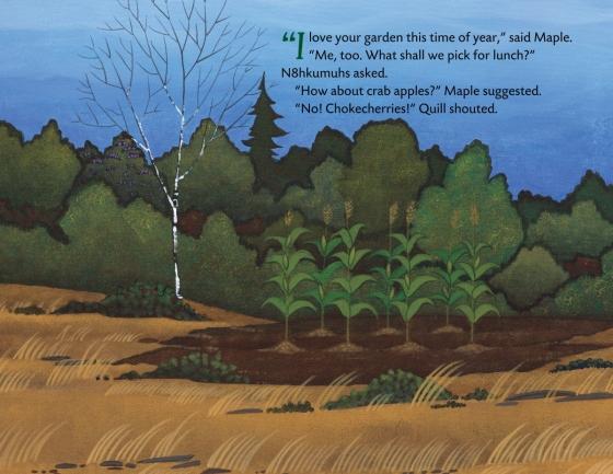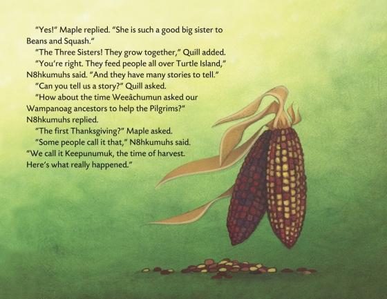 starred reviewThis picture book features a contemporary Wampanoag grandmother and her grandchildren. N8hkumuhs shares the story of the Three Sisters—Corn, Beans, and Squash—and the first Thanksgiving, known as “Keepunumuk” by the Wampanoag people. The book transitions into a combination of history and storytelling about contact between the “First Peoples” and the newcomers. This format will be novel to some young children given the setting and timeframe of the story, though the book attempts to differentiate the parts that are the story by changing the typeface and including ethereal-like images of the Three Sisters. “Before You Begin” and “Important Words to Know” sections also provide context. Rich back matter includes more information about the Wampanoag tribes, a traditional recipe, and a photo and information about the real Maple and Quill, the grandchildren in the story. Overall, this story is a good addition for the historical knowledge of the first Thanksgiving from the Wampanoag viewpoint.