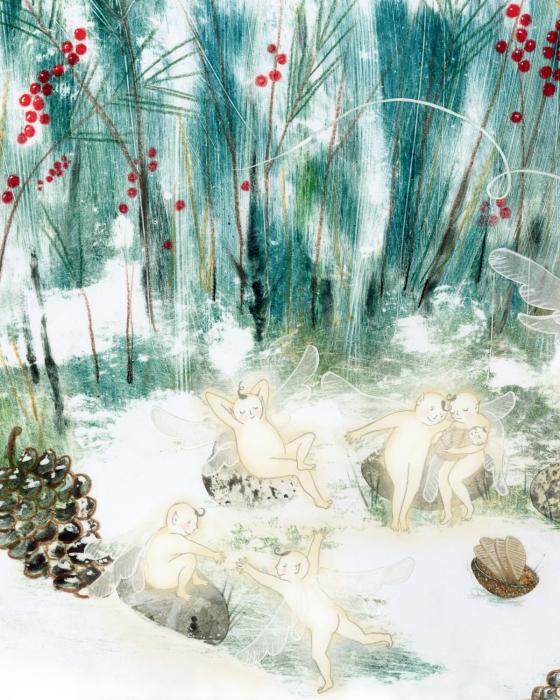 soothing, meditative prose with Goodale’s textured, mixed-media backdrops and vignettes, gently