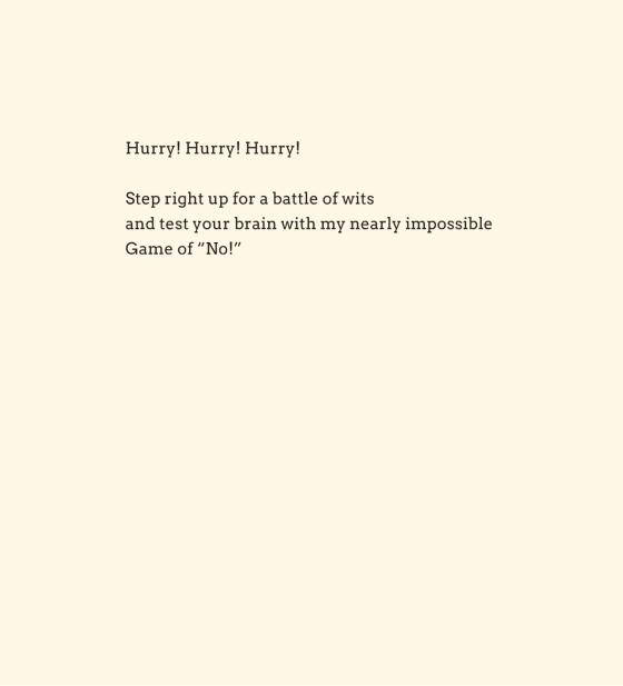 In a hilarious interactive picture book, the Geisel Award–winning creators of See the Cat challenge kids to answer every question with “NO”—even when their brain keeps insisting “YES.”Can you beat Mr. Fox at his Game of No? The rules are simple: every time he asks a question, you must respond with “NO.” If you accidentally say “YES,” then it’s back to the beginning of the book for you, where you must start all over again. Are you ready? (Oops!) Do you live on planet Earth? Are you stronger than a baby? What does Y-E-S spell? (Argh!) Kids will giggle uncontrollably as they gamely aim to avoid Mr. Fox’s clever traps—but just ask them if they’d like to read this book again, and they won’t be able to resist: “YES!”