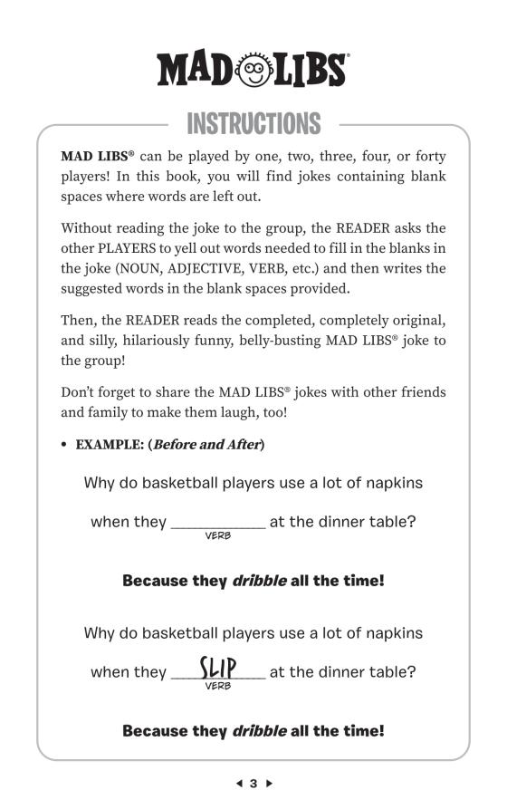 The Silly, Hilariously Funny, Belly-Busting Mad Libs Joke Book is the perfect activity for anyone! Play alone, in a group, or while crossing the road with a chicken! Mad Libs are a fun family activity recommended for ages 8 to NUMBER.