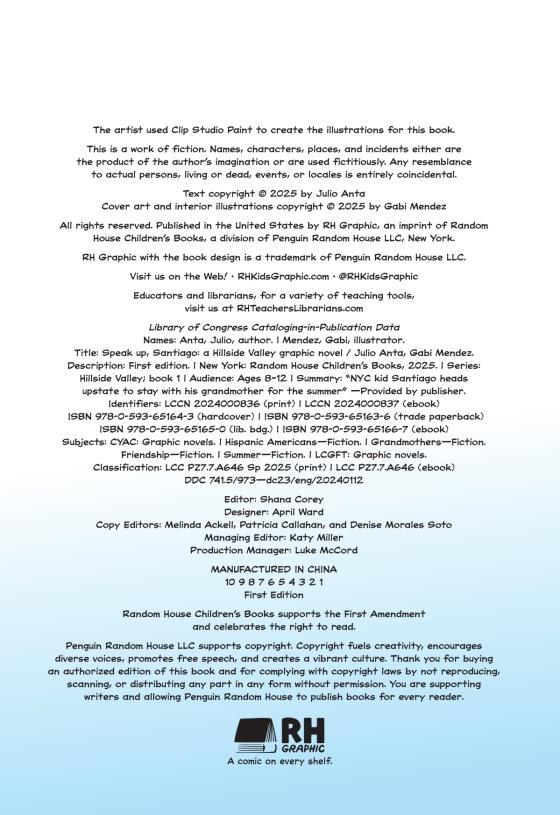 Welcome to Hillside Valley! 12 year-old New York city kid Santi is heading upstate, in the debut of this irresistible contemporary graphic novel series about friends, family, community and identity—just right for fans of Mexikid and the Click series!How can you speak up if you don't have the words? Santi is excited to spend the summer in Hillside Valley, meeting the local kids, eating his Abuela's delicious food, exploring! There's just one problem—Santi doesn't speak Spanish that well and it feels like everyone he meets in Hillside does. There's Sol (she's a soccer player who really loves books), Willie, (the artist), Alejandro (Santi's unofficial tour guide!), and Nico (Alejandro's brother and blue belt in karate). In between all of their adventures in Hillside, Santi can't help but worry about his Spanish-what if he can't keep up?! Does that mean he's not Colombian enough? Will Santi find his confidence and his voice? Or will his worries cost him his new friendships...and the chance to play in Hillside's summer soccer tournament?!