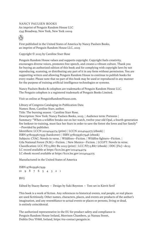In this riveting coming-of-age survival story in verse perfect for fans of Alan Gratz, a fire lookout-in-training must find her courage when a wildfire breaks out on her watch.Twelve-year-old Opal has a secret: she’s deathly afraid of fire. Still Opal is preparing to become a fourth-generation lookout on Wolf Mountain, deep in the New Mexico wilderness. She, Mom, and Gran live at ten thousand feet in a single room at the top of a fire tower. They are responsible for spotting any hint of smoke before it becomes an uncontrollable blaze.