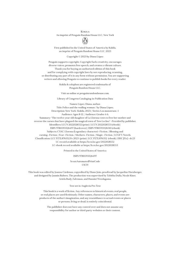The twelve-year-old daughter of La Llorona vows to free her mother and reverse the curses that have plagued the magical town of Tres Leches in this delightfully sweet and spellbinding adventure by beloved author Diana López.When Felice learns that she’s the daughter of La Llorona, she catches a ride to the magical town of Tres Leches, where her mother is said to be haunting the river. Growing up with her uncle Clem in Corpus Christi, Felice knew that she had been rescued from drowning—it’s where her intense fear of water comes from—but she had no idea her mother remained trapped between worlds, looking for her. Guided by the magical town’s eccentric mayor, Felice vows to help her mother make peace with the events that turned her into the most famous monstruo of US–Mexico border lore. Along the way, she meets the children of other monstruos, like La Lechuza and the Dancing Devil, and together they free Tres Leches from magical and metaphorical curses that have haunted its people for generations.