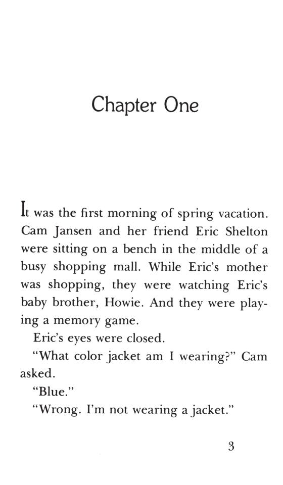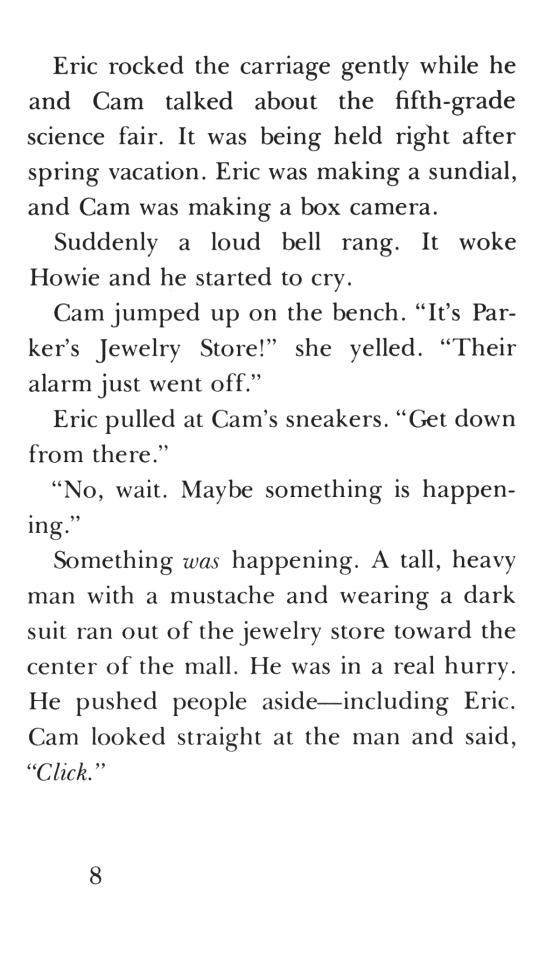 No mystery is too great for super-sleuth Cam Jansen and her amazing photographic memory! Can Cam help catch the diamond thief? Cam and her friend Eric are sitting at the mall when the jewelry store is robbed. Cam sees the thief, but the police arrest the wrong person. Now it's up to Cam to catch the real criminal!