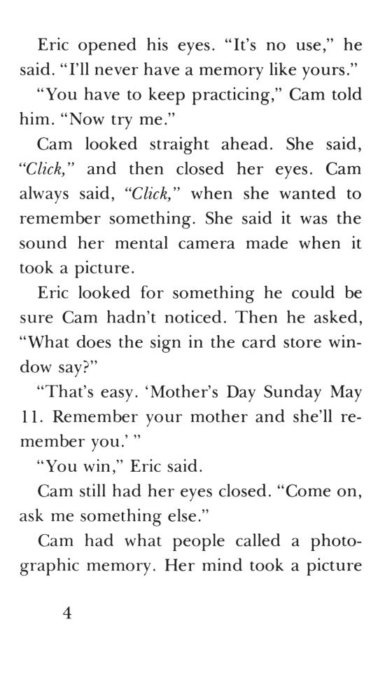 "What wrongdoer is any match for Cam Jansen, the girl with the amazing photographic memory?" (