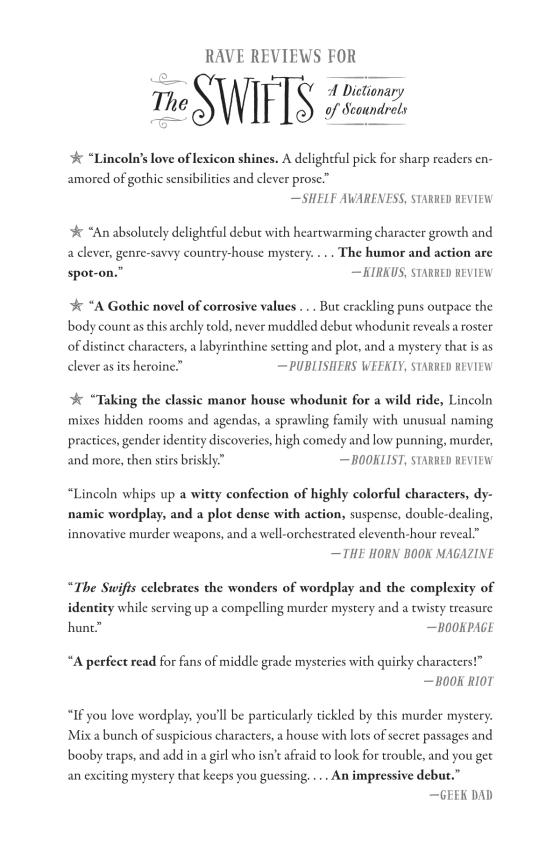 “The Swifts celebrates the wonders of wordplay and the complexity of identity while serving up a compelling murder mystery and a twisty treasure hunt.” —