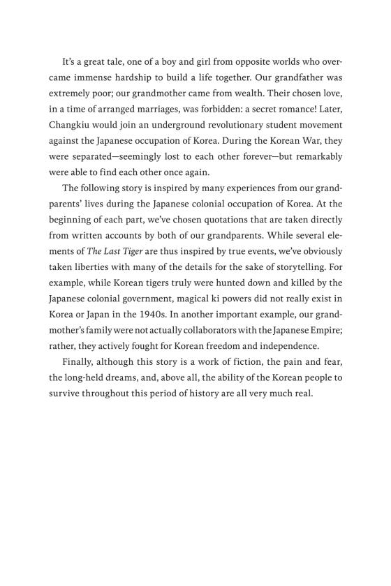 A NEW YORK TIMES BESTSELLER • Inspired by true stories from the authors’ grandparents’ lives during one of the darkest periods in Korean history, The Last Tiger is a debut young adult fantasy novel about the power of love to give voice to a silenced people.