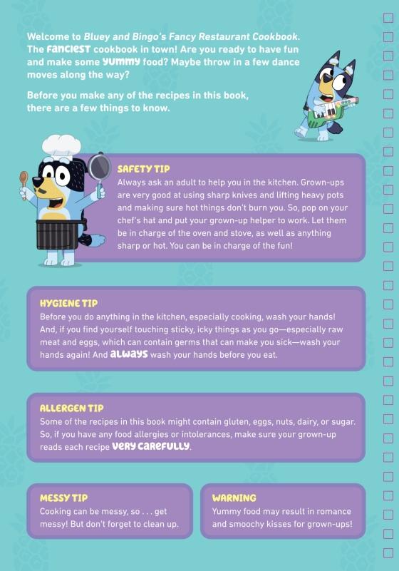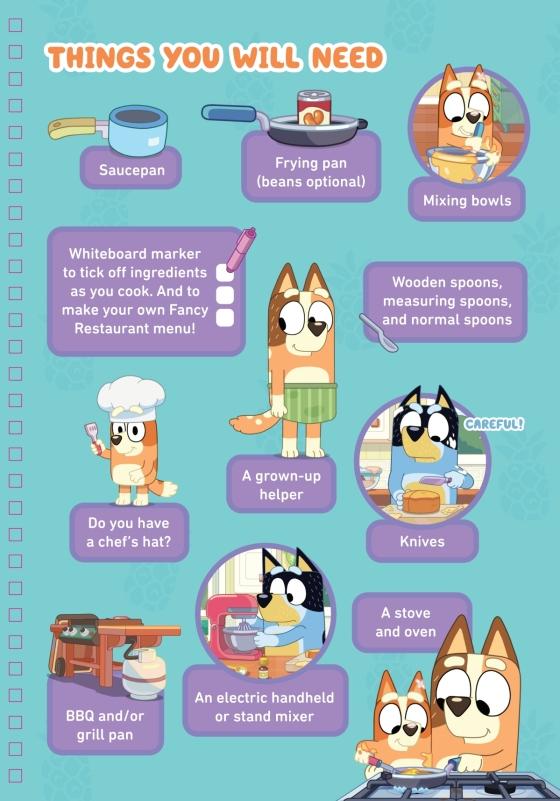 A deliciously fun cookbook perfect for fans of the wildly successful animated series Bluey, as seen on Disney+Learn how to make yummy food with Bluey and Bingo! Bake some Shadowland Cupcakes, make BBQ Sausages, Capsicum Salad, or write your very own Fancy Restaurant menu! This spiral bound cookbook includes 13 fun recipes to cook for everyone to enjoy, and lays flat to make it easy to read.