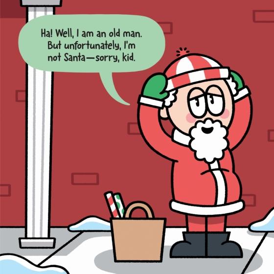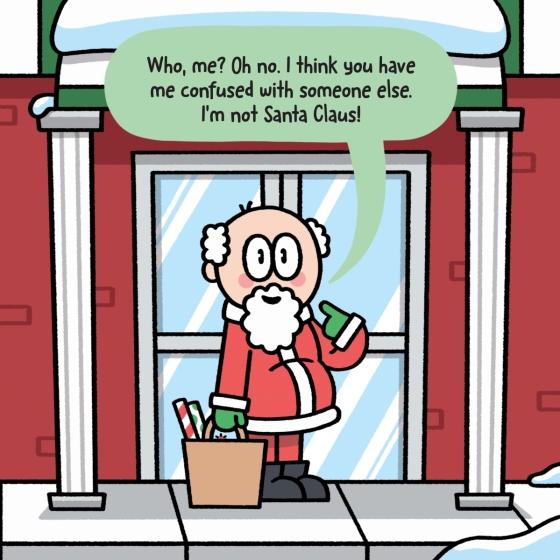 He says he’s just a regular old man, but he has a fluffy white beard and a red coat and hat, and even says "Ho ho ho"! He