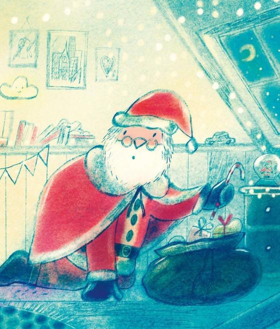With boundless energy and curiosity, the child shows Santa around the house and accompanies him on his global sleigh ride. . . . The series of beguiling scenarios plays out in digital artwork that features black outlines and gauzy textures frequently backlit by snow-flurry-filtered moonglow and streetlights.